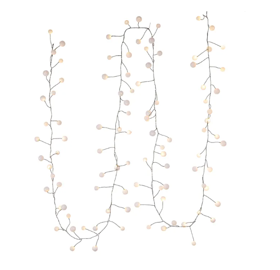 This 100-light warm white LED cluster bead garland light with green wire is a new addition to our extensive light line. With 8' of warm white LED lights this cluster bead garland light set will be a modern addition to your home holiday lighting décor.